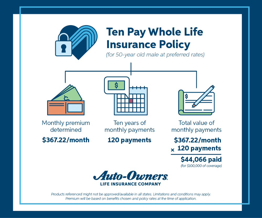 Jack just turned 50 and decided he needs a life insurance policy. He purchases an Auto-Owners $100,000 Ten Pay whole life policy at preferred rates, and has a monthly premium of about $367.22. *Since he chose a Ten Pay policy, he will pay his monthly premium ($367.22) for 10 years. That equates to 120 payments (12 monthly payments x 10 years = 120 payments).